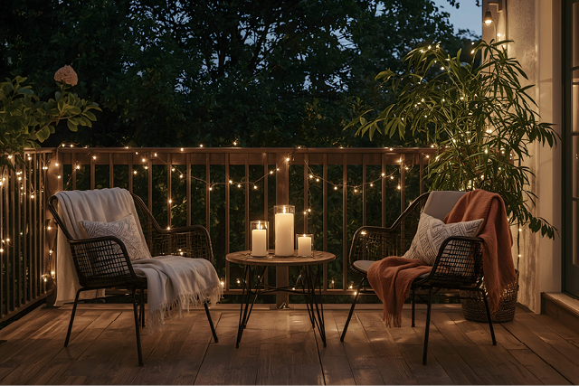 Beleuchtung ist das Geheimnis für echte Wohlfühlmomente. Lichterketten, Laternen und Solarleuchten tauchen den Balkon in ein sanftes, warmes Licht. Wer mag, kombiniert verschiedene Lichtquellen und schafft so eine romantische Atmosphäre, die an mediterrane Sommernächte erinnert, ideal für Sommerabende.